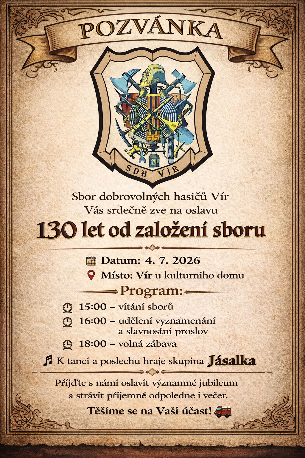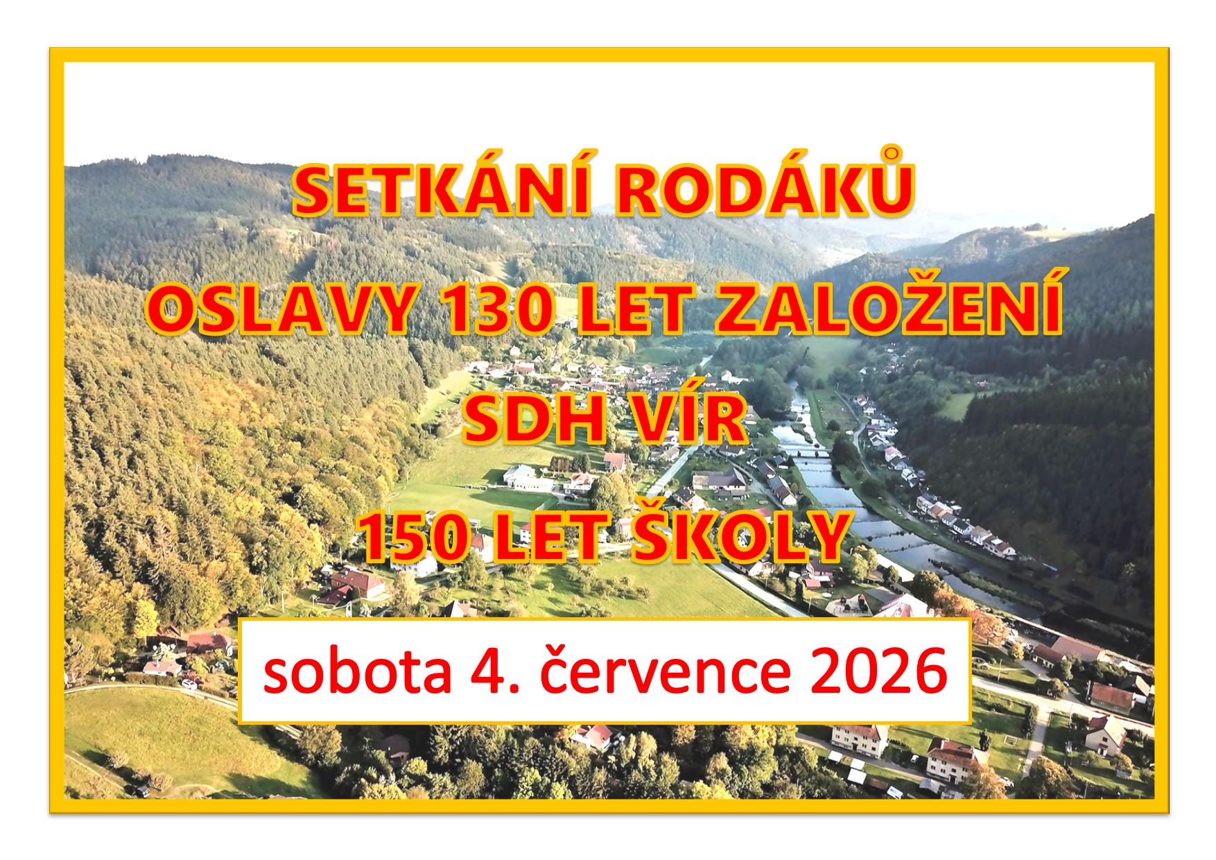 Přijměte pozvání na SETKÁNÍ RODÁKŮ, OSLAVY 130 LET SDH VÍR a 150 LET ŠKOLY.