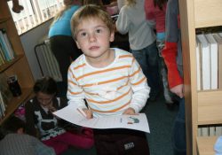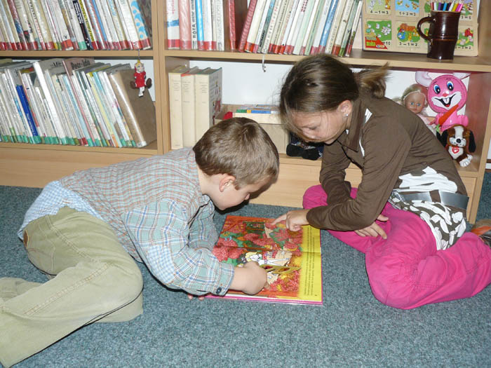 Mezi první návštěvníky patřily i děti z družiny. Obohatily interiér knihovny o nádherný strom Knihovník a obrázky. Po důkladné revizi knižního fondu děti přednesly nacvičenou básničku a spořádaly mísu bonbónů. Některé z nich se ještě odpoledne vrátily, aby dostlaly své průkazky a vypůjčily si knížky.