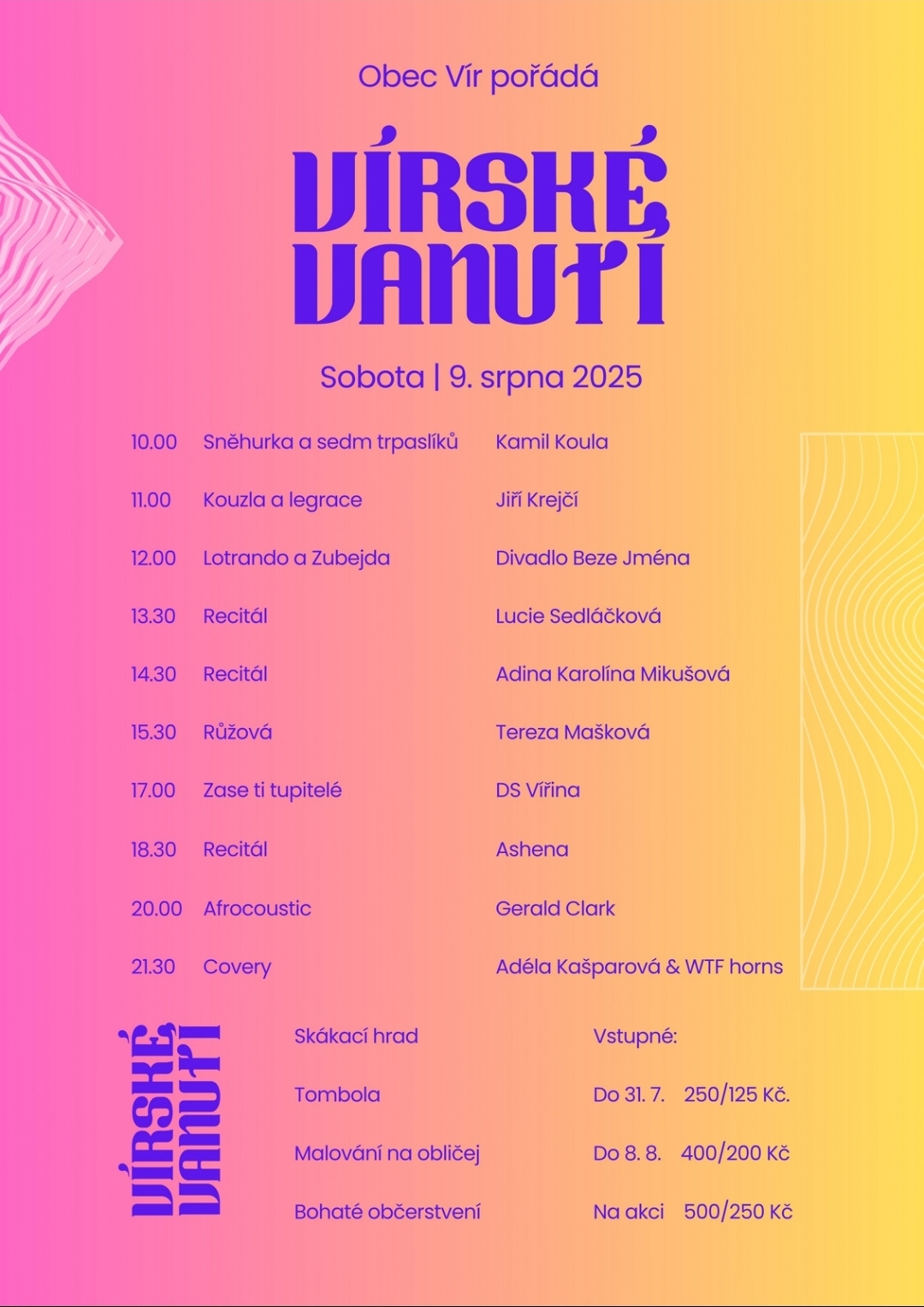 Vírské vanutí odstartuje v 10 hodin Kamil Koula, kterého můžete znát, co by mladého horolezce z filmu Třetí skoba pro Kocoura. K nám zavítá s pohádkovým představením plným písniček – Sněhurka a sedm trpaslíků.