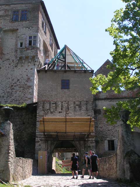 Brána střážící jádro hradu, jejíž střecha stejně jako střecha vpravo stojící budovy lehla popelem. Po měsíci již řemeslníci za plného turistického ruchu pracují na její opravě.