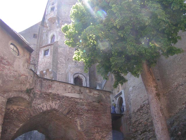Jediný vchod do paláce. Jiná cesta do obytných prostor hradu nevede… padací most nahradil pevný můstek.
