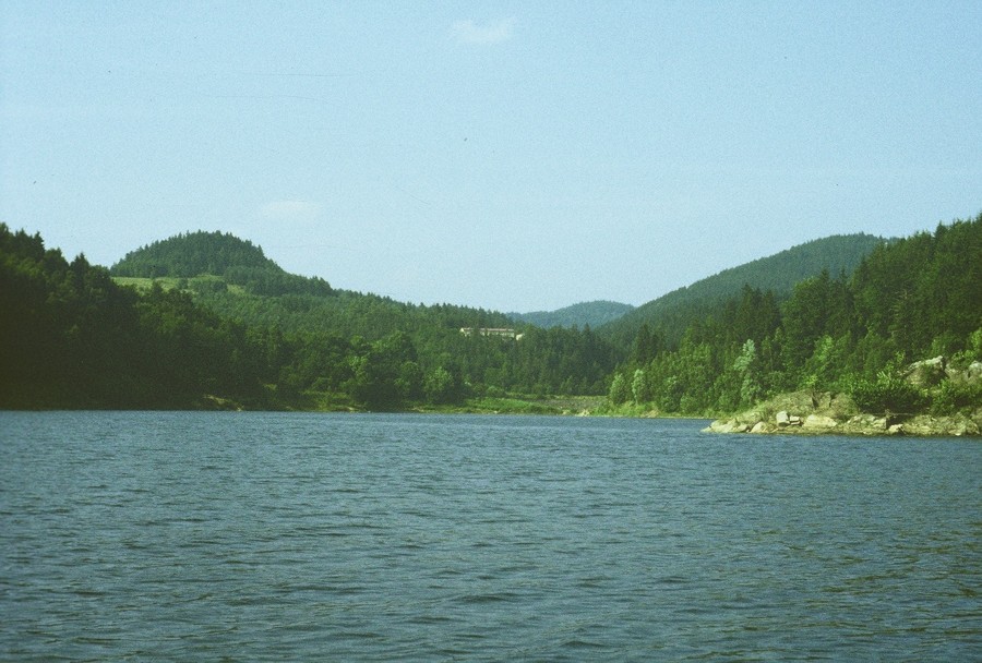 Pohled do Korouhvické zátoky z jezera v pozadí z „hotelem“ Zbrojovky Brno. Ten už dnes také nestojí a v místě, kde stál je jen rumisko.