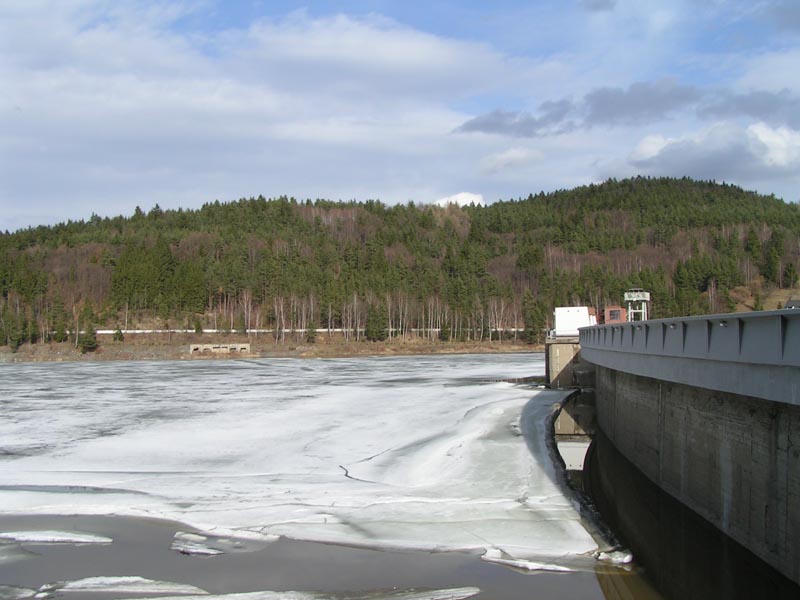 Dvoutýdenní obleva zvedla hladinu vody téměř až k přepadům. Zbývají dva metry (sobota 1.dubna 2006). Betonárka zmizela pod hladinou.