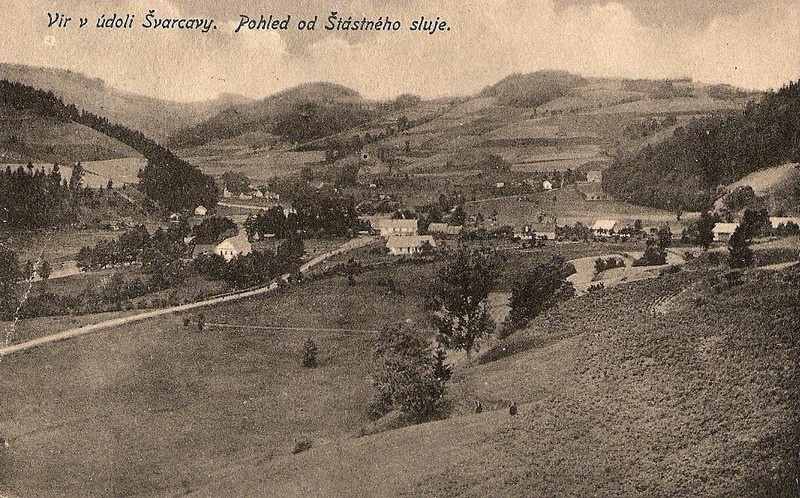 Pohled z „Ostrážné“,nyní od stávajících chat.Šťastného sluj byla těsně nad silnicí na začátku vyrovnávací nádrže (viz jiné foto).