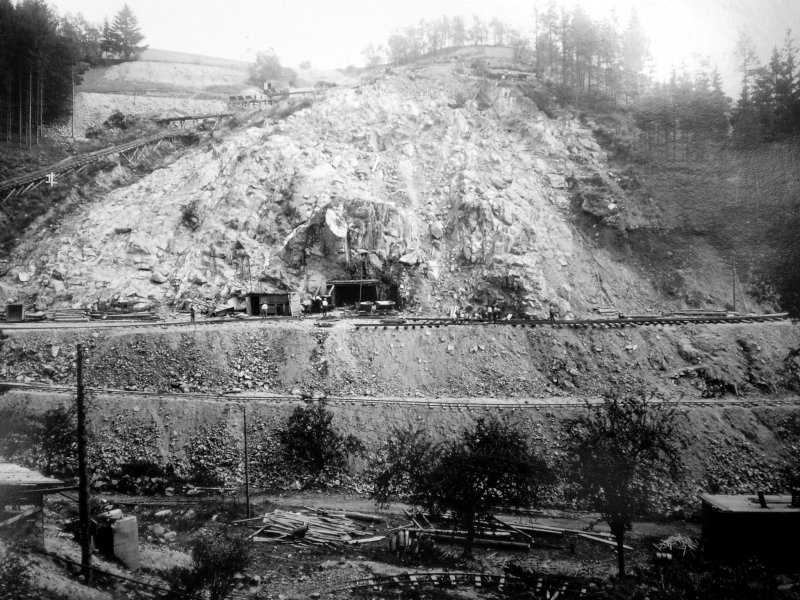 Pracuje se dále na skrývce svahu. Jsou patrné již dva kužely kolem svislých šachet do štoly, která byla na kótě 470 m.n.m.