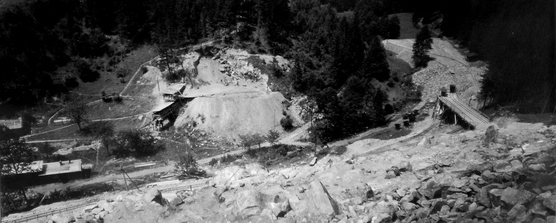 Pohled ze svahu kamenolomu na protější skálu, kde byl otevřen provizorní lom s drtírnou kamene, který byl využíván pro výstavbu propustí – kanálů v Korouhvici pro potoky od Polomi a Nyklovic a další (pod Chlumem, betonáže pro zařízení staveniště přehrady).