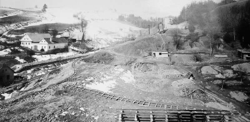 Stavení čp. 2 rodiny Kadlecových, které jako druhé bylo zbouráno, aby ustoupilo budovanému náspu pro budoucí silnici Vír – Hluboké. Patrná propust potoka od Polomi.