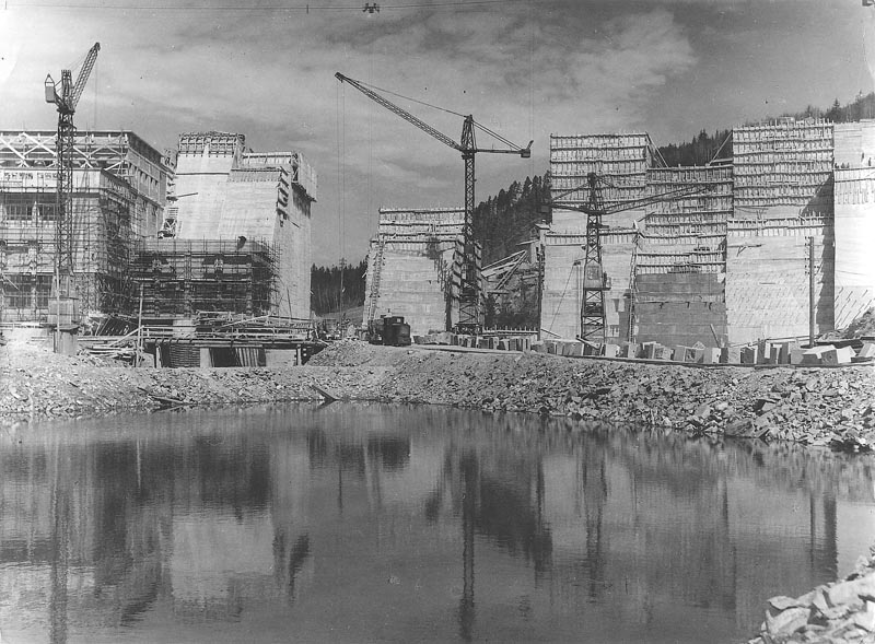 Svratka je již převedena přes přelivný blok 0, jsou založeny a rostou bloky levého i pravého břehu s cílem vytvořit průběžnou jeřábovou dráhu pro věžové jeřáby Wolf, aby bylo možno zajistit plynulou betonáž na dvou pracovištích současně.