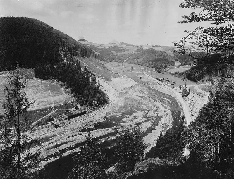 Hráz přehrady se na obou stranách zapírá o skály, které bylo nutno před stavbou obnažit. Obdobně došlo k vykácení lesů na svazích až po budoucí úroveň hladiny, ale to na této fotce ještě není patrné.