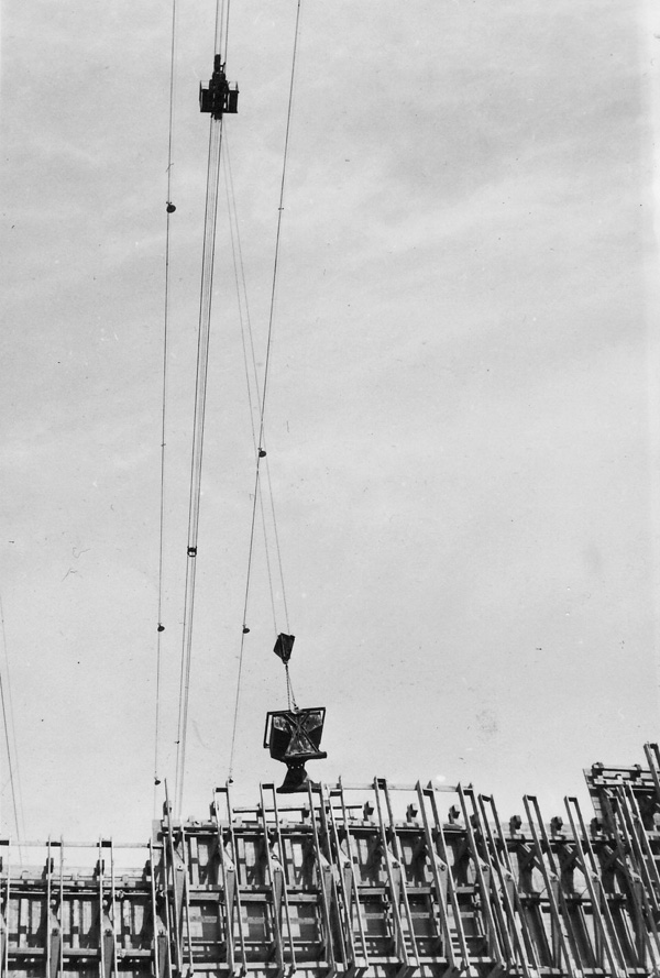 na bočních lanech napnutých souběžně s lany jeřábu byly zavěšeny reflektory,každý s 1000 w žárovkou,které zabezpečovaly hlavní osvětlení staveniště.žárovky se vyměnovaly z kočky jeřábu.