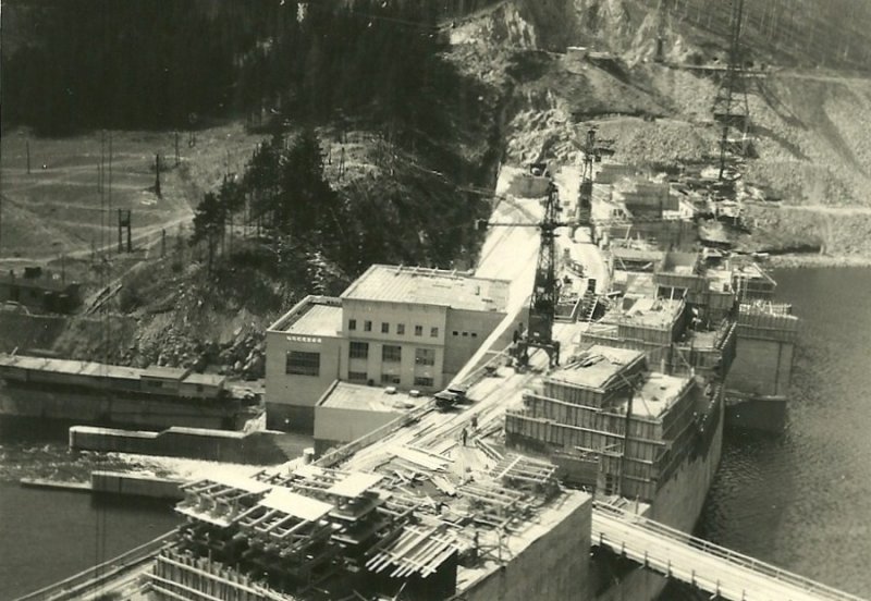 Z této fotografie je možné si představit i úskalí souběřné betonáže věžovým jeřábem Wolf a Kabelovým jeřábem.Zatím co věžové jeřáby měnily svá postavení po dráze v oblouku hráze kabelový jeřáb měl postavení v přímce/sečně oblouku/.Kromě toho nosná lana kabeláku měla při zatížení v klidu průhyb asi 5 m,při zastavení kočky s břemenem došlo ke „zhoupnutí“,které průhyb zvětšovalo.Zvláště ve střední třetině rozpětí kabeláku bylo riskantní betonovat bloky v přímce s kabelákem.Přesto se opožděním betonáže u Wolfu ten případ stal,došlo ke kolizi,specielní četa pro jeřáby ,jak ukazuje fotografie z Fotogalerie měla práci.