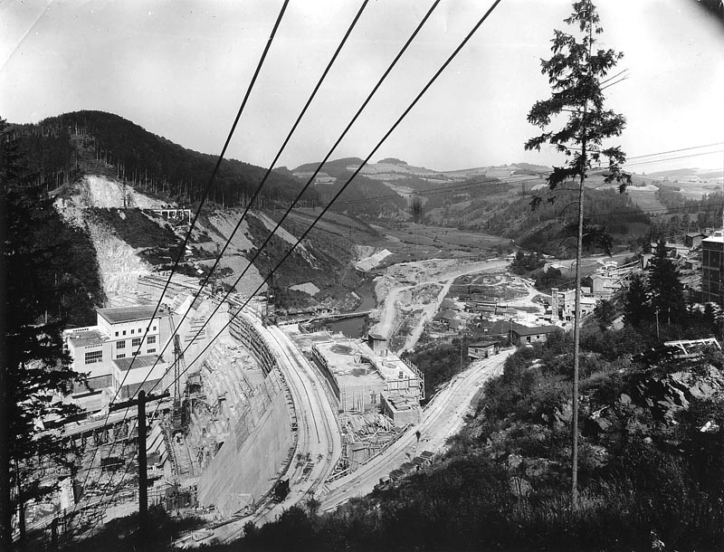 Na protějším břehu je vidět plošina,po které pojížděla jedna věž lanového jeřábu.