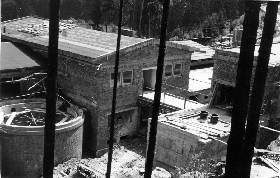 Vlevo „čiřič“, osmimetrový „sud“, v němž probíhá „vyvločkování“ nečistot před odtokem upravované vody do filtrů. Mostek vede do budovy laboratoří.