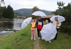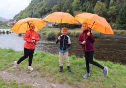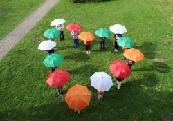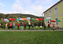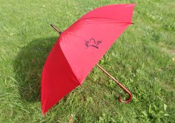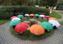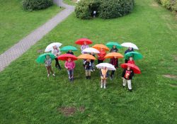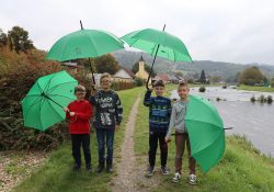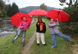 Naši školáčci vám právě předvádějí, že nové deštníky s vkusným logem je před nepřízní počasí skvěle ochrání.