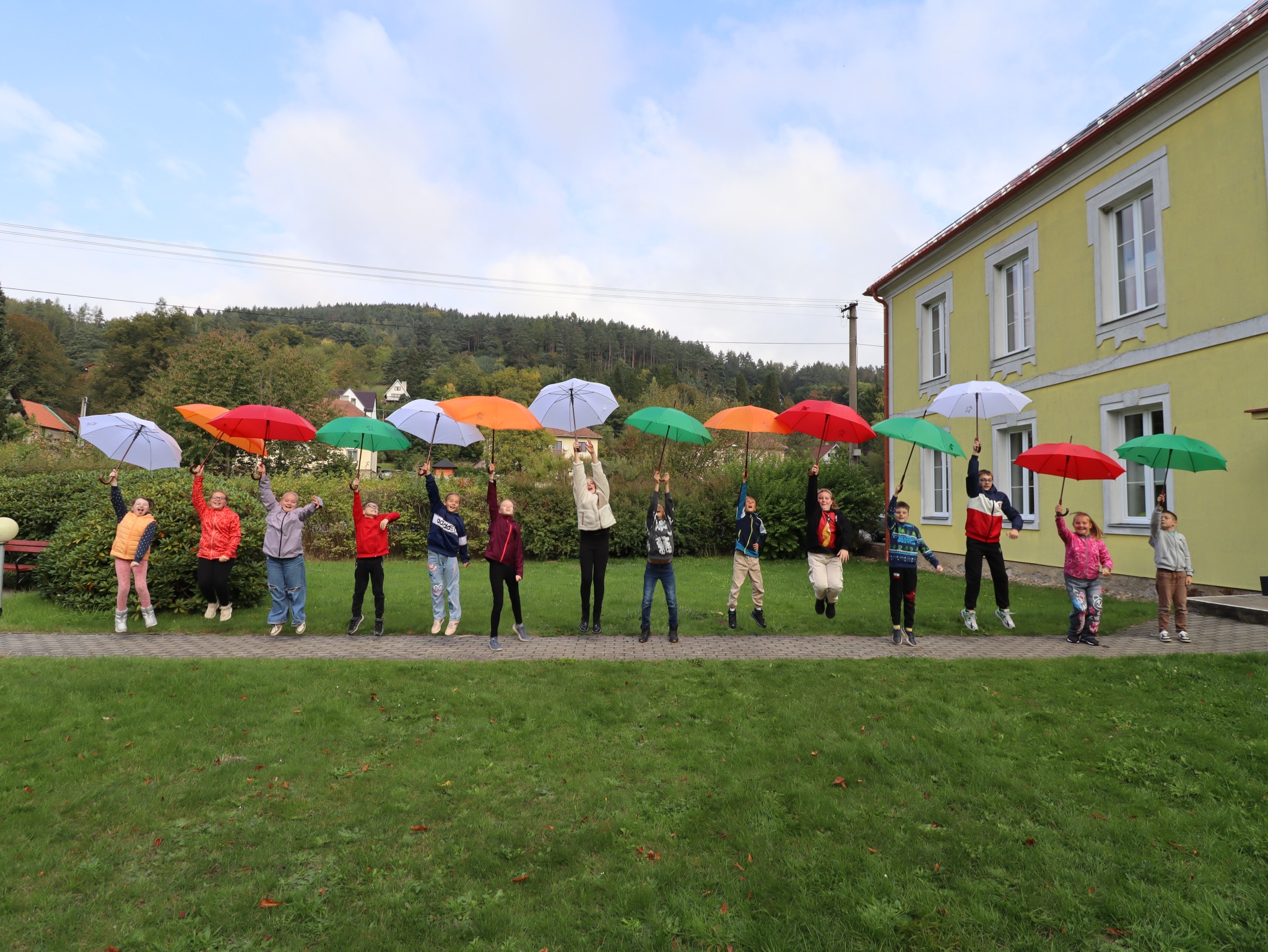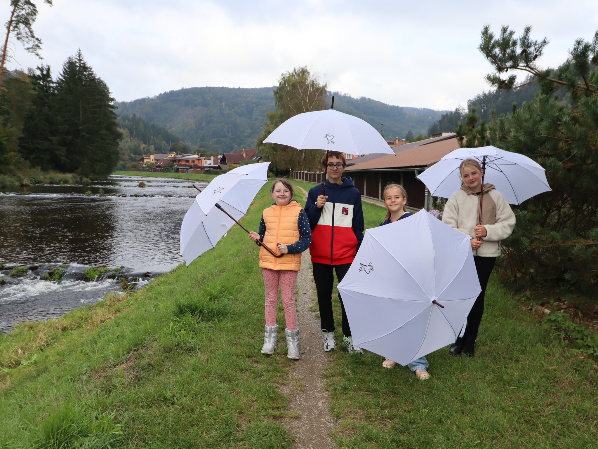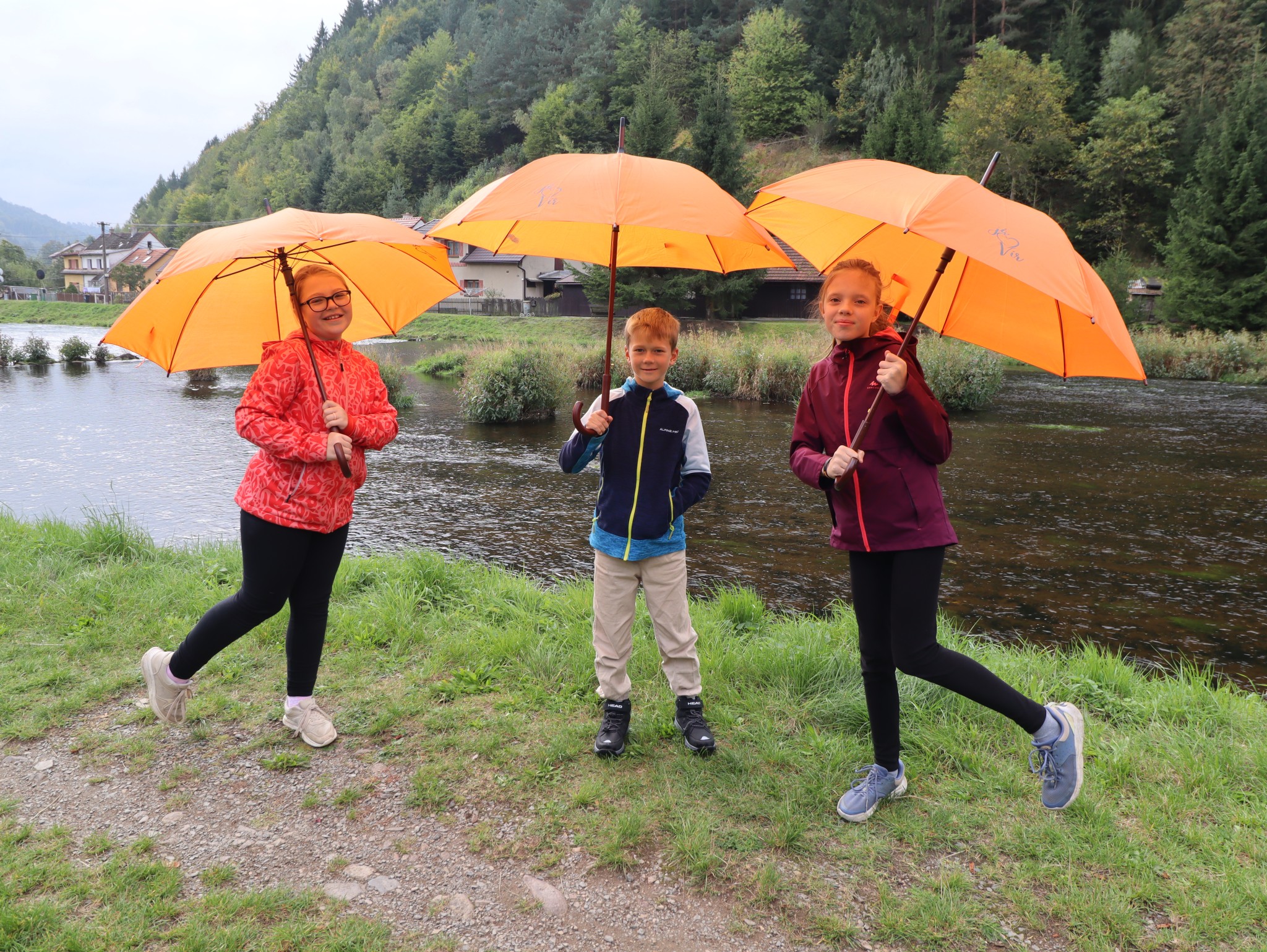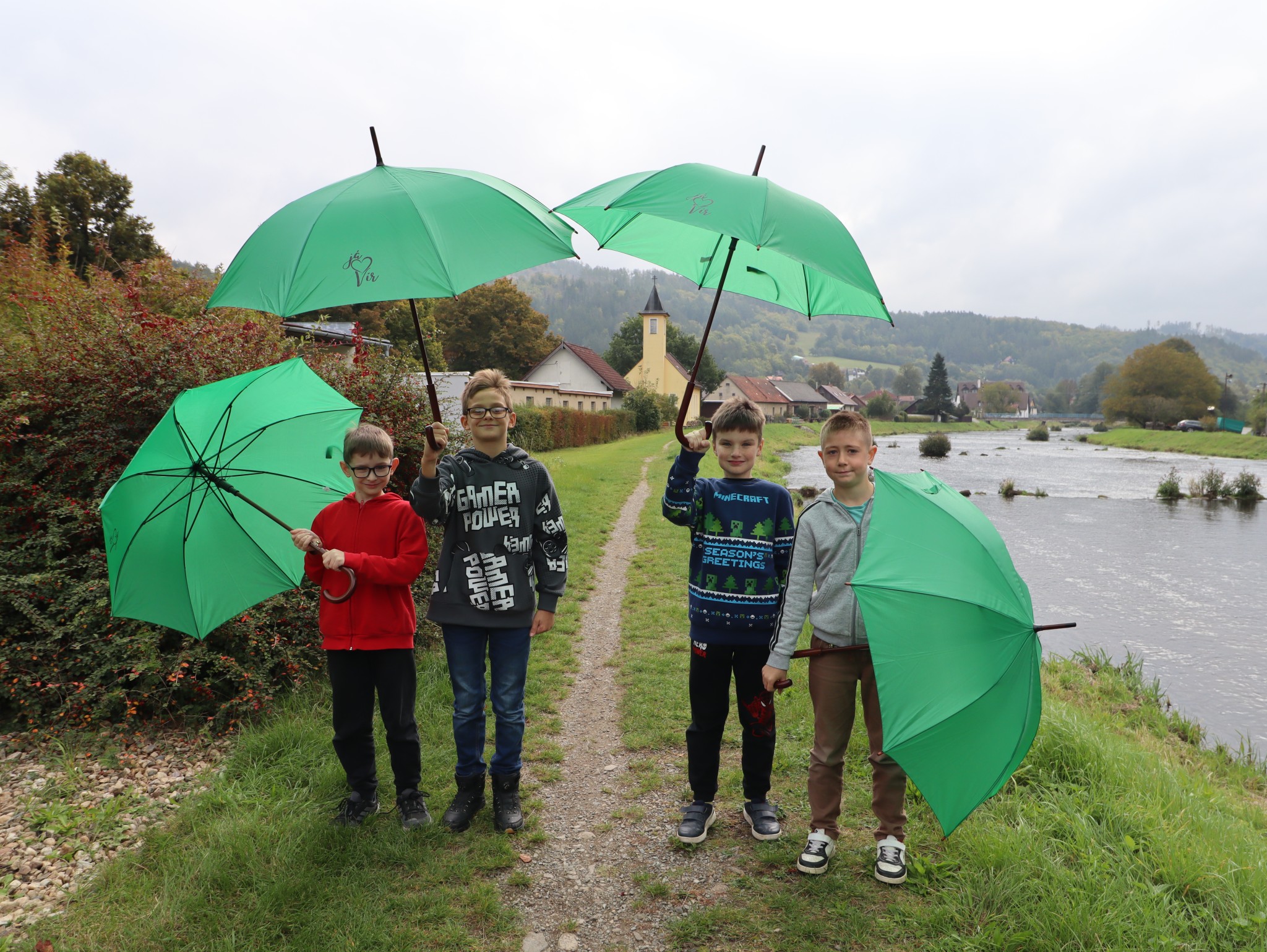 Naši školáčci vám právě předvádějí, že nové deštníky s vkusným logem je před nepřízní počasí skvěle ochrání.