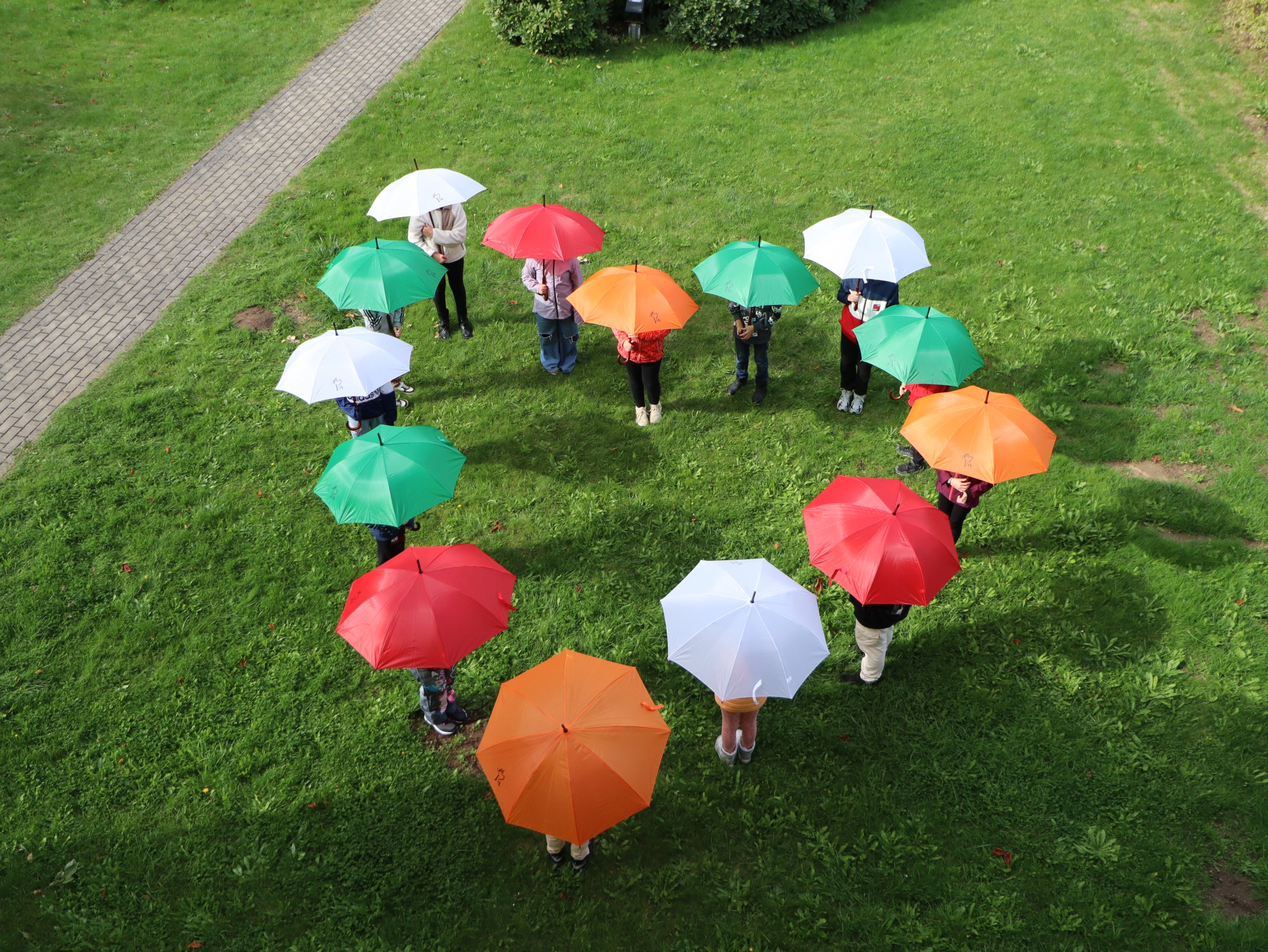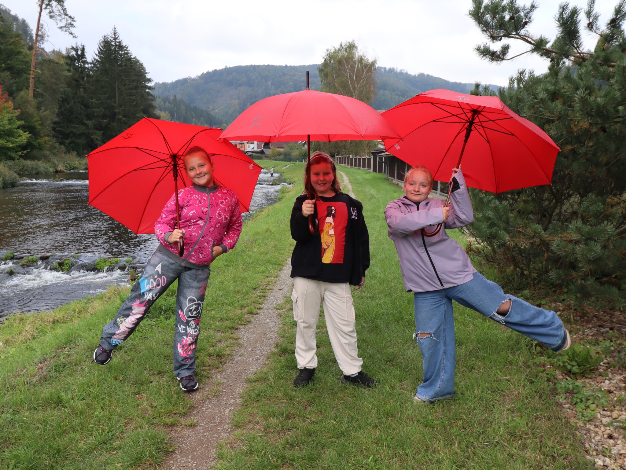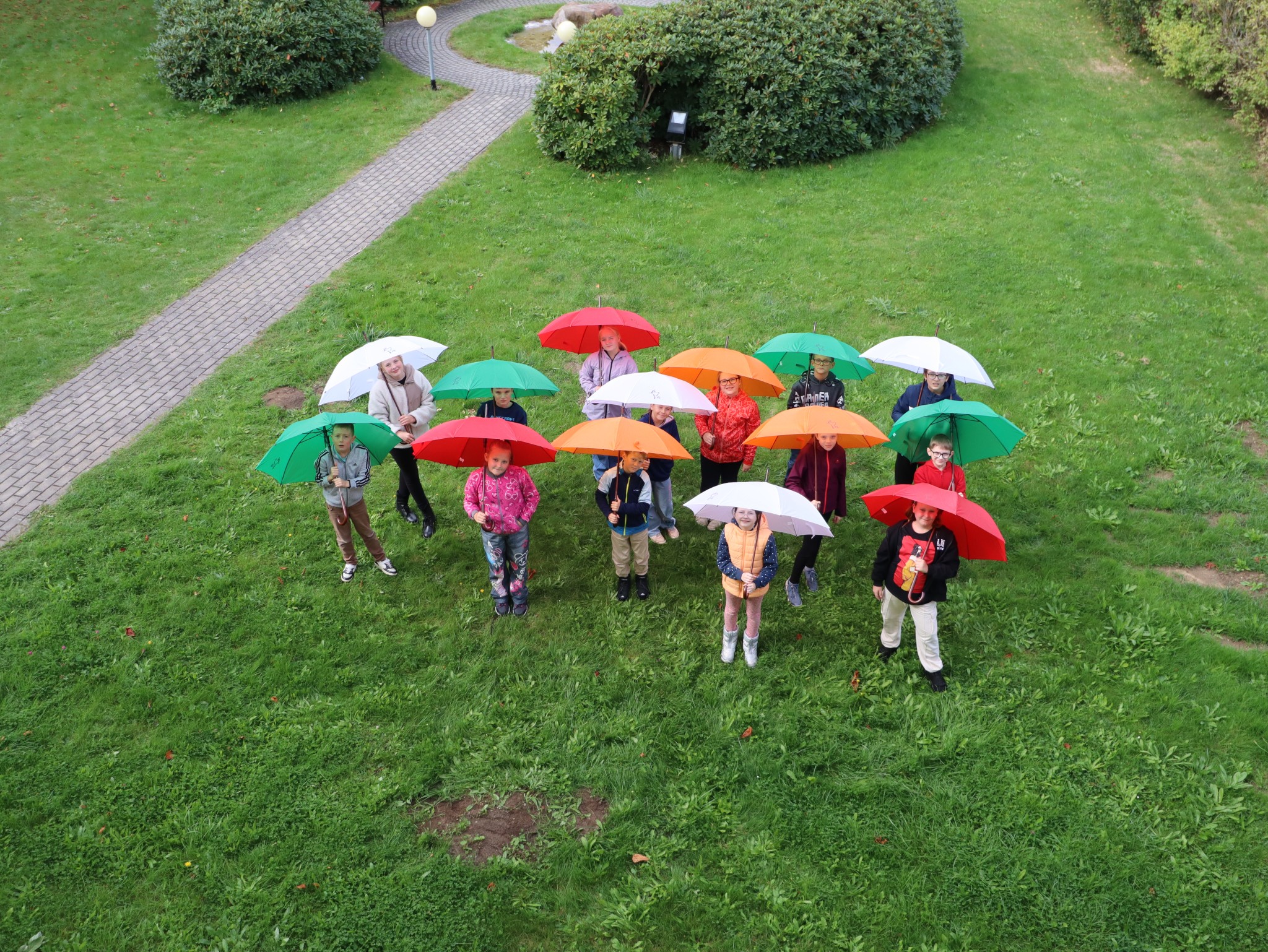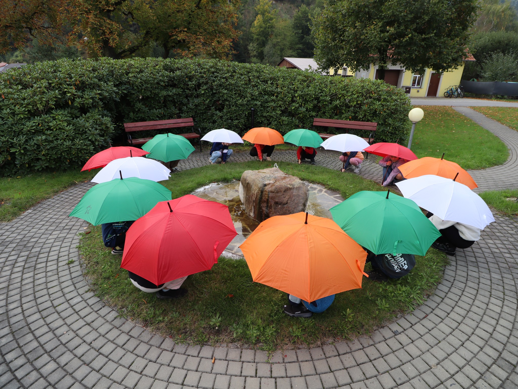 Naši školáčci vám právě předvádějí, že nové deštníky s vkusným logem je před nepřízní počasí skvěle ochrání.
