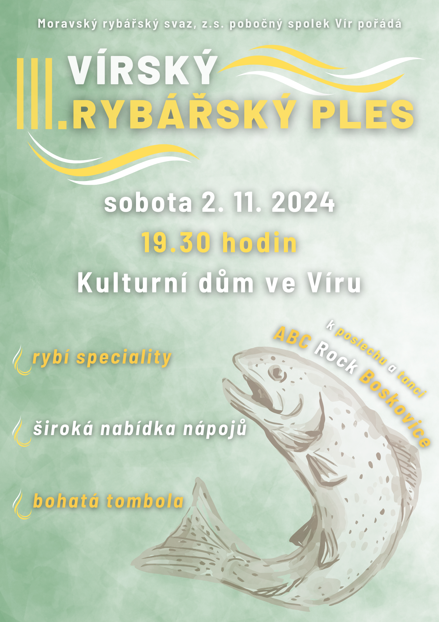 Rybářský spolek Vír zve všechny občany na III. VÍRSKÝ RYBÁŘSKÝ PLES, který se uskuteční v sobotu 2. 11. 2024 v Kulturním domě ve Víru. Začátek plesu je v 19:30. Oddělená kuchyně v prostorách nově zrekonstruované kotelny otevřena již od 18:00.