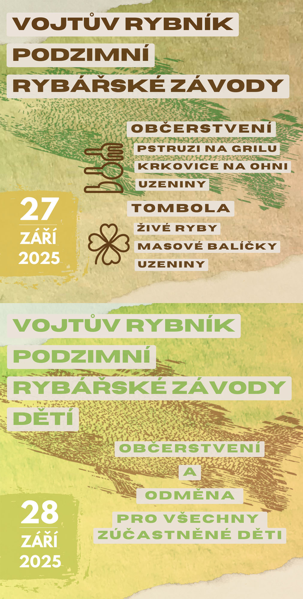 Moravský rybářský svaz, z.s. pobočný spolek Vír pořádá podzimní kola dvouzávodového poháru v lovu kaprů na jeden prut na Vojtově rybníku pro děti a dospělé.
