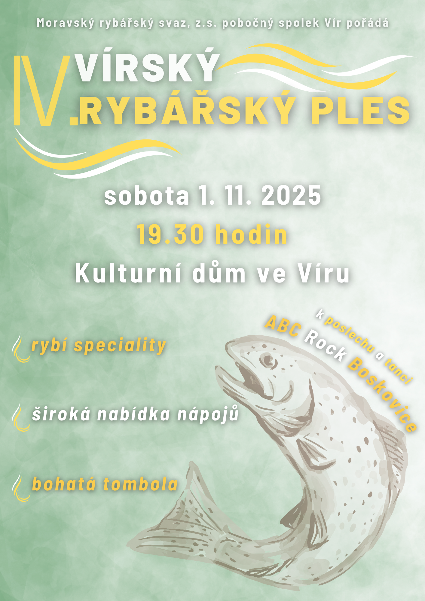 Rybářský spolek Vír zve všechny občany na IV. VÍRSKÝ RYBÁŘSKÝ PLES, který se uskuteční v sobotu 1. 11. 2025 v Kulturním domě ve Víru. Začátek plesu je v 19:30. Oddělená kuchyně ve společenské místnosti otevřena od 18:00.