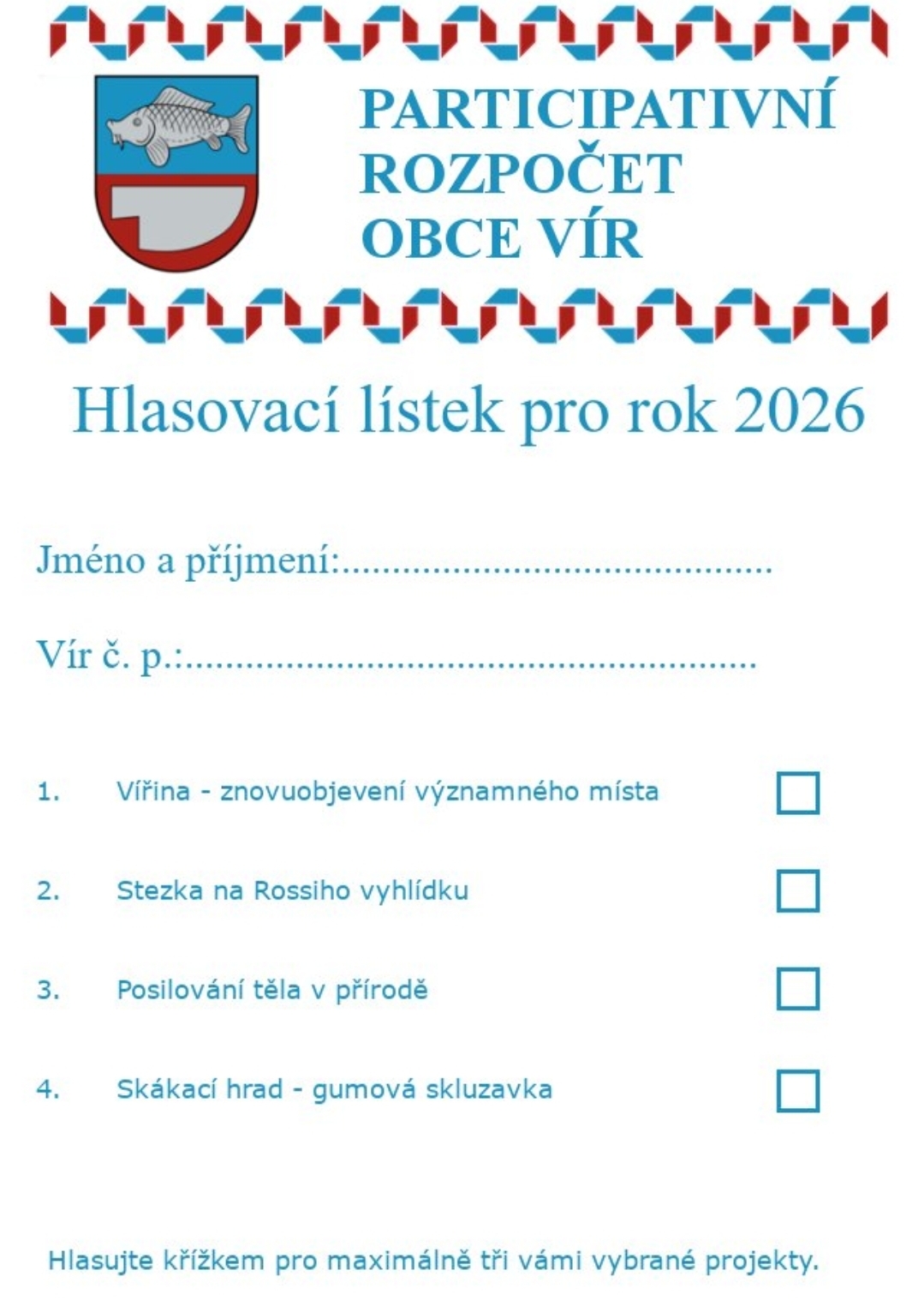 Do 31. března můžete hlasovat o nejlepší projekty participativního rozpočtu obce Vír pro rok 2026. Hlasuje se na obecním úřadu, každý dospělý občan Víru má až 3 hlasy. Hlasovací lístky obdržíte na OÚ.