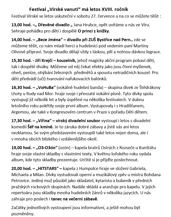 Mnohokrát děkujeme všem účinkujícím, dobrovolníkům i vám,kdo jste přišli podpořit kulturu ve Víru 😊 Počasí nám přálo – letošní Vírské Vanutí jsme si užili! (FB Vírské Vanutí)